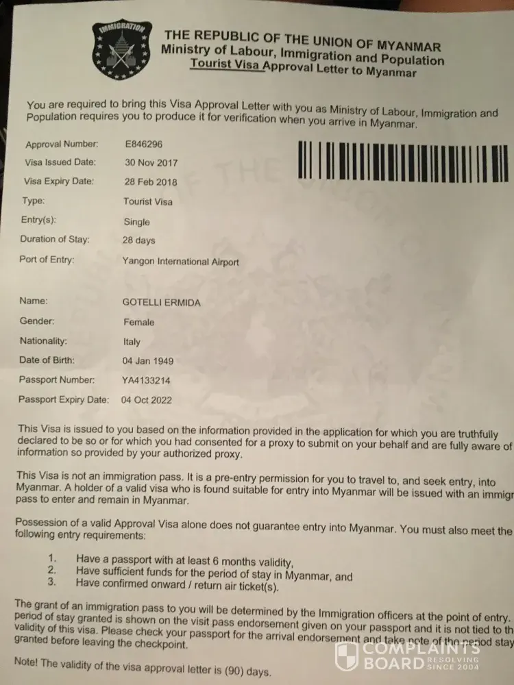 Having been shut out by Alitalia, we purchased at the airport a new set of tickets that allowed us to travel on the same morning from Genova to Bangkok via Air France. As anticipated, we learned that my wife's visa to Myanmar was resolved, without any delay, a few hours later after we left Genova (see email communicating this to the check-in counter in Genova). We then purchased a separate set of tickets from Bangkok to Yangon, Myanmar. In the end, we reached Myanmar after 30 hours.