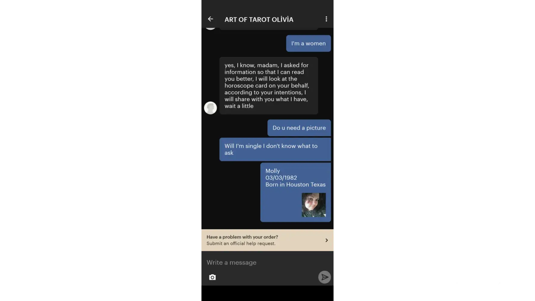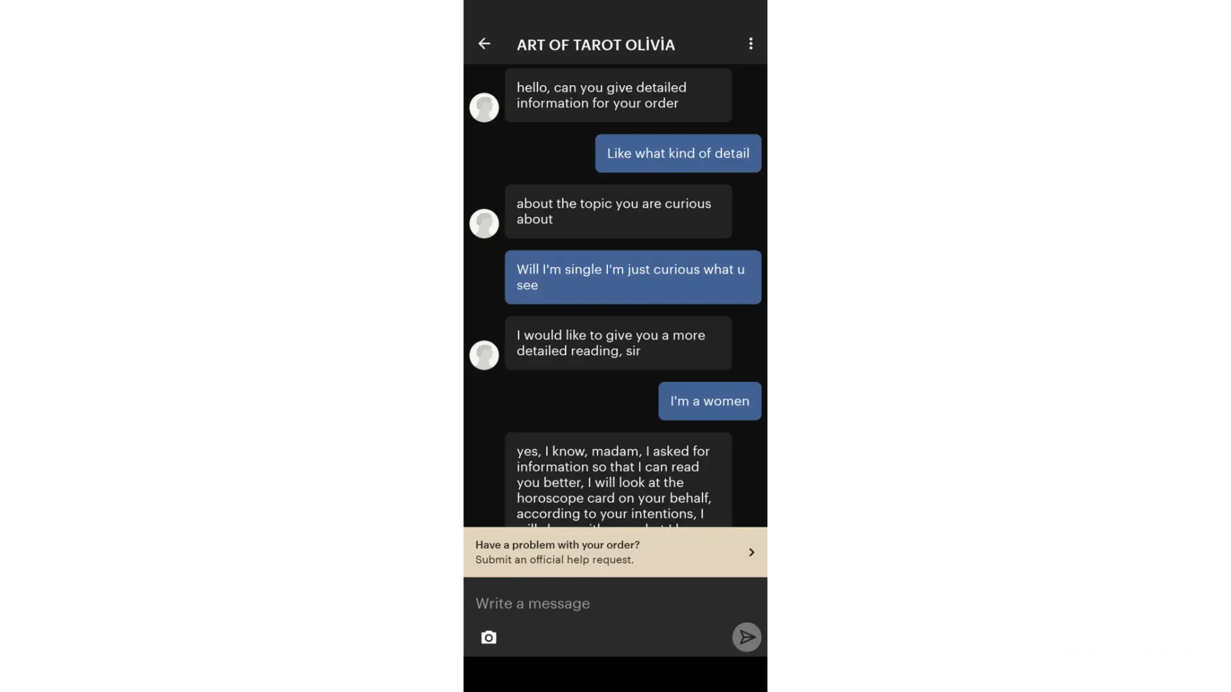 I want to report a seller on Etsy.i ordered a card reading and she messaged me calling me sir after I had sent her my information that I was a women including a picture.i correct her that I was a women .she started telling me stuff which I didn't appreciate it.i just want a simple card reading.i sent a screenshot of the seller porfile.