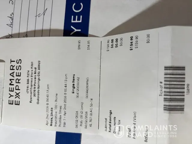 ON 4/2/26 i ordered glasses in person,received a text when they were ready. Went in on 4/6/26 to pickup & I tried them on and it was the wrong prescription.The worker said they would remake them be ready later that day. I went into the store on 04/7 to pickup but she said i owed another $#0 to get the glasses remade so I gladly paid.I asked about sunglasse...