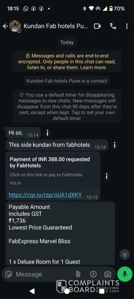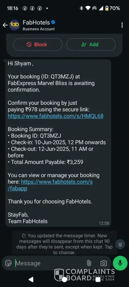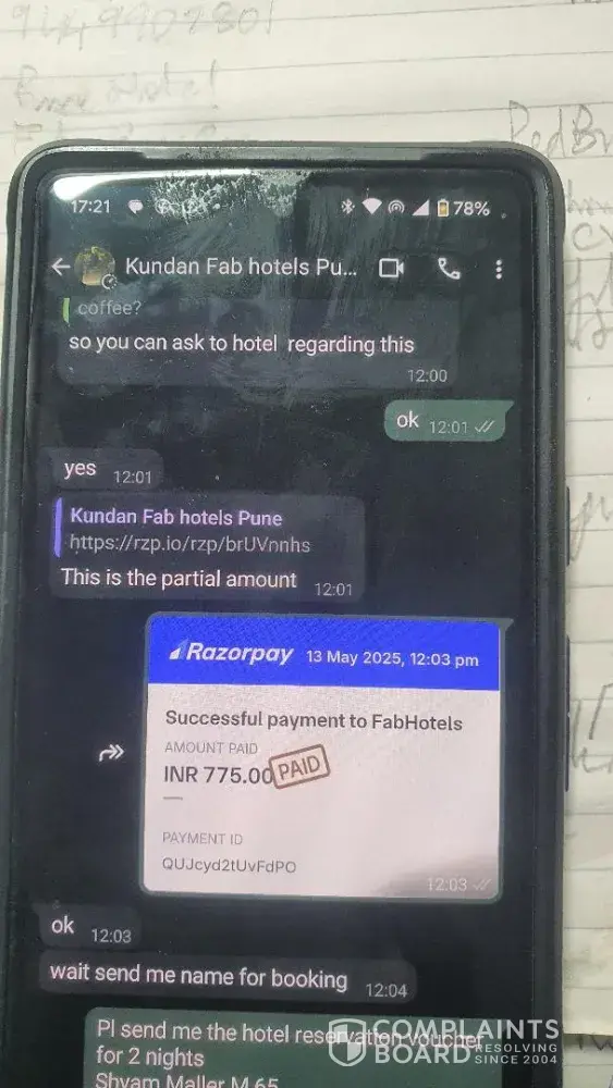 In conclusion, I would like to warn anyone who is considering booking with FabHotels to be very cautious. It is essential to double-check the hotel's affiliation with FabHotels before making any payments. I hope that my experience will serve as a warning to others and prevent them from going through the same ordeal.