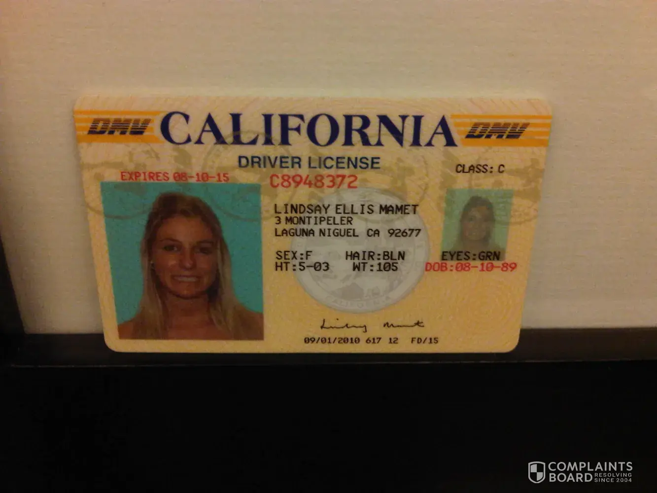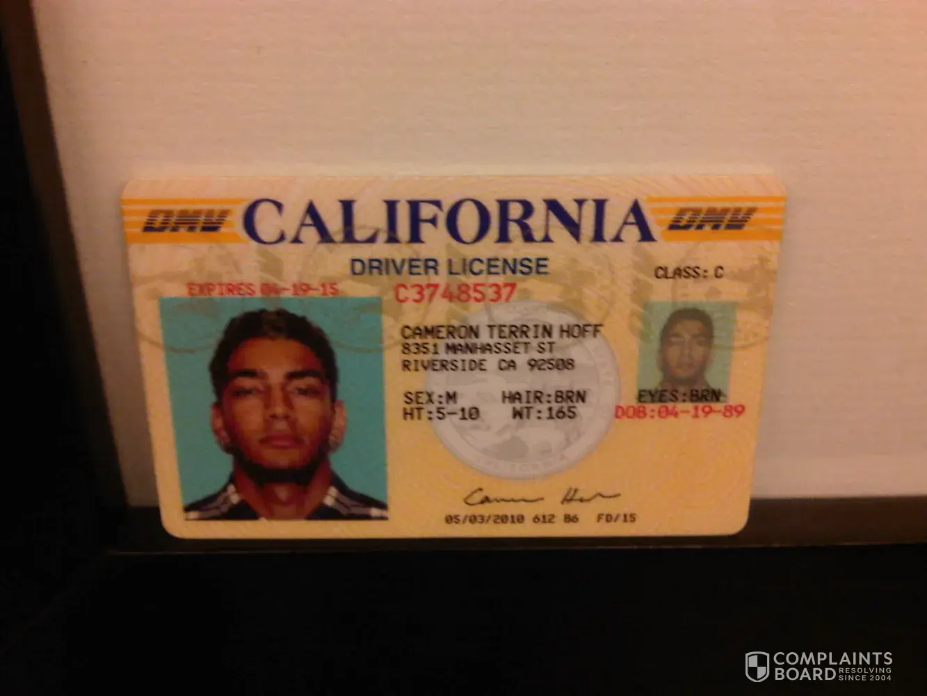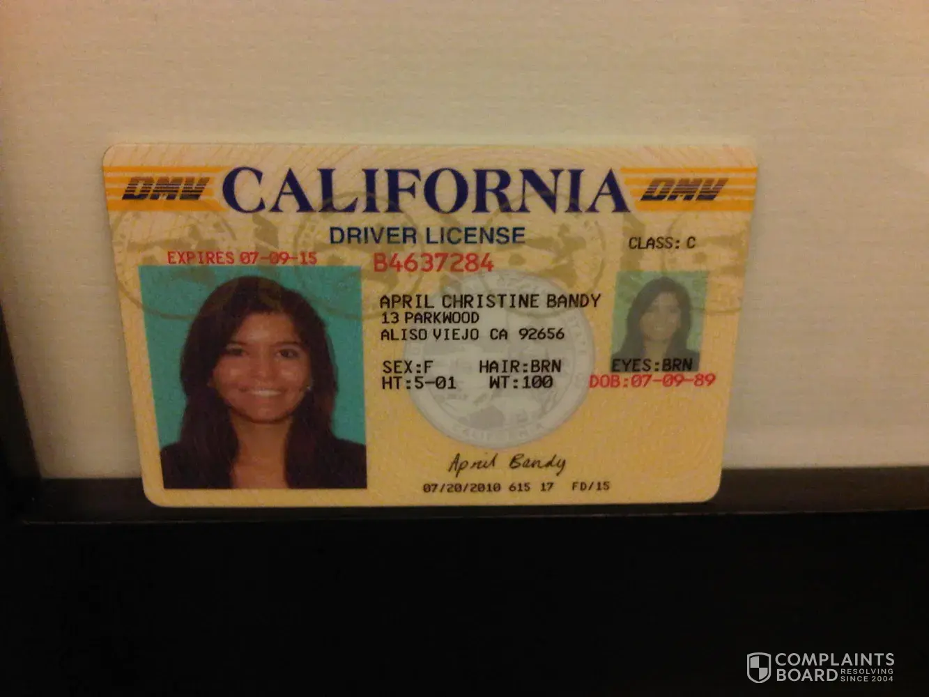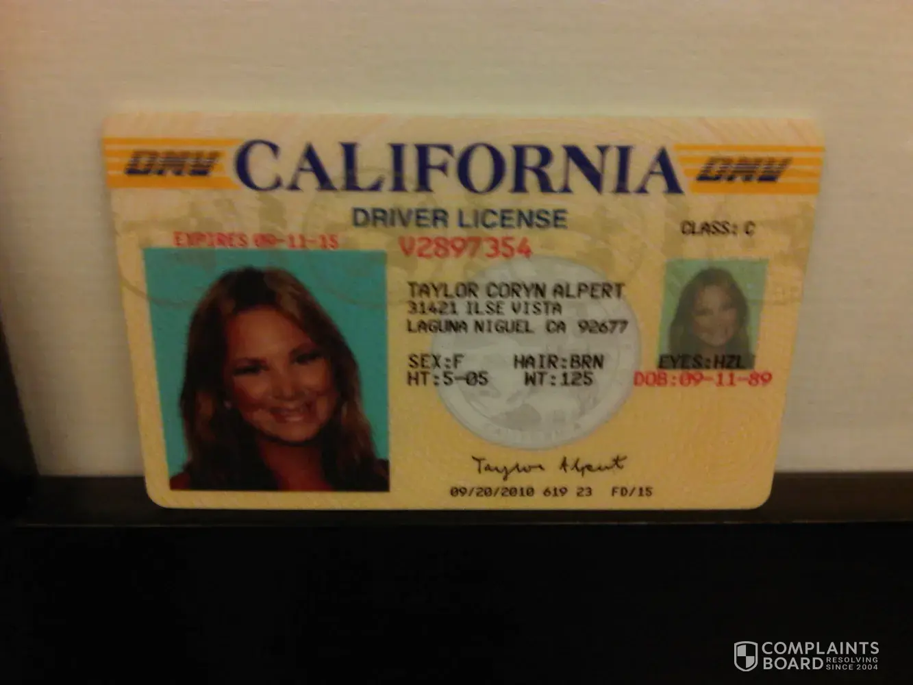 Did not pay after she had gotten IDs for herself and the following people: April Bandy Cameron Hoff Taylor Alpert Zachary Azouz Lindsay Mamet Jaeren Reese Her address is either 3700 South Plaza Drive Apt. H212 Santa Ana, CA 92704 or Cameron Hoff 8351 Manhasset Street Riverside, CA 92508