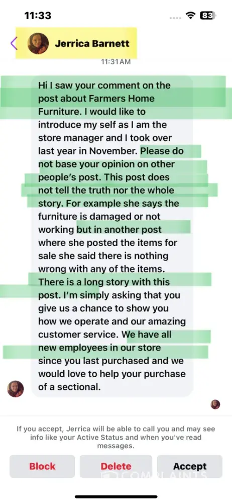 Farmers Home Furniture’s behavior is disgraceful. Your company clearly does not value its customers, the quality of your products is subpar, and your tactics are unethical. I strongly urge anyone considering doing business with you to think twice.