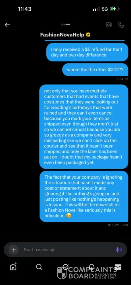 Shop with caution! Ive sent over 4 emails with NO response, called and left voicemails with NEVER getting a response, my bank actually even called and they transferred her to some shop in the mall in Florida? She wasn't happy. I even tried getting ahold of them on Instagram and they BLOCKED AND DELETED my comments just simply asking about my order. I had to dispute them with my bank because I placed an order on Jan. 15 to get this jumpsuit that would be perfect for my birthday in a few months and got a bra along with it because I needed one with the type of jumpsuit it was. Anyways, they took the money out that same day and then a few days pass and still no tracking info even though they claim 2 day shipping... so I try emailing them asking if there was a problem or what is going on? I never hear anything back, but later that day on Jan. 18 they send out shipping and tracking info. I was just happy to finally have the chance to track it and its on its way! They said it was scheduled to be delivered Jan. 21. Jan. 20 came around (Friday) and at 9pm they email me saying "oops out of stock here is a $21 refund on this gift card, just use code during checkout" and let me remind you... the jumpsuit I purchased was 29.99 ALONE... plus I paid for the 12.99 bra and the $6.00... but they only want to give me $21.00? I thought it was weird hey sent me tracking and shipping info that stated that the jumpsuit was in it? So I went to check on their website and the jumpsuit was STILL in stock in EVERY size... so I was thinking maybe it was a glitch and somehow they messed up. SO stupid me, I order again trying to get that dang jumpsuit and used the gif card they "refunded" me with and also paid EXTRA and $6 shipping just in order to try to get the jumpsuit again that they said was out of stock... So I order it and some boots to go along with it because I figured mine as well order something else too since i'm ordering and they have their $6 shipping fee and also this "string me along" bodysuit I saw last minute that i fell in love with. I placed that order and was excited! AGAIN the day before my shipment was supposed to be here they sent an email not even saying it the jumpsuit was out of stock but just refunding my money on a gift card without any reason given... and AGAIN it was only $23.00 when the jumpsuit is $29.99 plus $6 for shipping! I was furious at this point because they don't allow "cash back" only refunds on gift cards so you are forced to purchase through them again, and thats how they get you and then you have to pay extra $6 for shopping costs. When my package did finally come... the two out of three items were there (because they just wanted to refund me for the bodysuit) and those two items were the WRONG SIZE! It even stated on the receipt (which I have pics of and wish I could post) that the size in the bodysuit was XS and size 5.5 in the boots... AND guess what their policy is on bodysuits?!? NO RETURNS OR EXCHANGES NO EXCEPTIONS. SO. I ordered an EXTRA SMALL and received an EXTRA LARGE, there is literally no way I could fit that and now am stuck with a $22.99 bodysuit that I can't wear, return, or exchange because they messed up on their part, even though it clearly states XS, they just failed to read the receipt correctly. AND want to know another funny thing? On the tag of the body suit it CLEARLY states $12.97, but I was charged $22.99? I don't know what they are doing, but when I noticed that my jaw dropped. They literally sold me a bodysuit originally priced $12.97 IN THE WRONG SIZE for $22.99! Like HOW CAN THEY DO THAT?! And for my boots? They are a 6.5! Which they kind of work, but are not fitting enough to where I would be comfortable wearing them out. Then the fabric on the heel of one of the boots has glued seemed and & it's coming apart? I paid $52 for poorly made boots... and I am so worried the heel will break in half if I actually wear them for an extended period of time... I just am so so upset and dissapointed with Fashion Nova and my first time trying to purchase from them. ALL I wanted was to look cute for my birthday, but Fashion Nova failed to deliever my items.