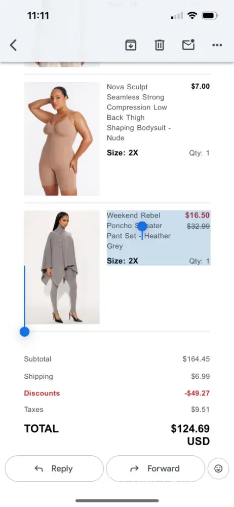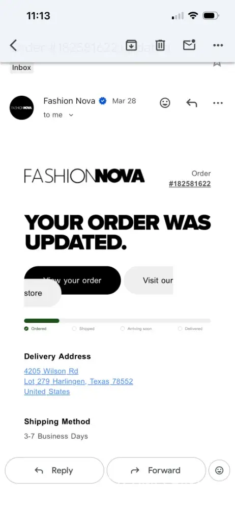 I Order clothing from fashion Nova on X-XX-XX in the amount of $211 order priority next day shipping $14 shipping to