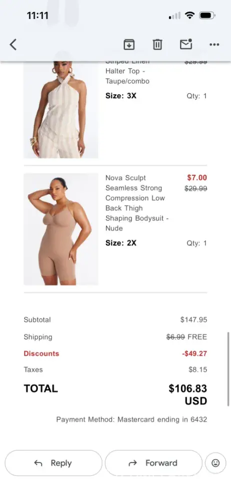 I will NEVER order from these people again. They. HIRED this fraudulent company call LASERSHIP to deliver our clothes I nearly spent $200.00 for and tbe idiots never delivered my items yet they stole them and put that they delivered them. I personally paid Lasership a visit all to be told they lost my clothes and they will post on the site that they lost them. I contacted Fashion nova again all to be sent the SAME REPETITIVE EMAIL. My packaged shows delivered and they dont accommodate anyone when it shows delivered. So Im at a lost of $200.00.