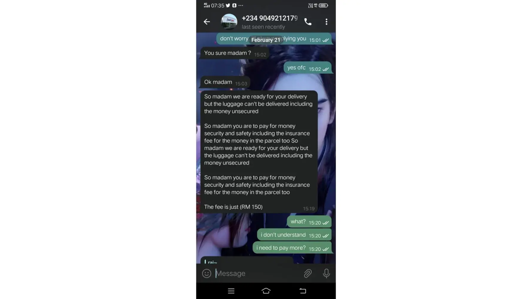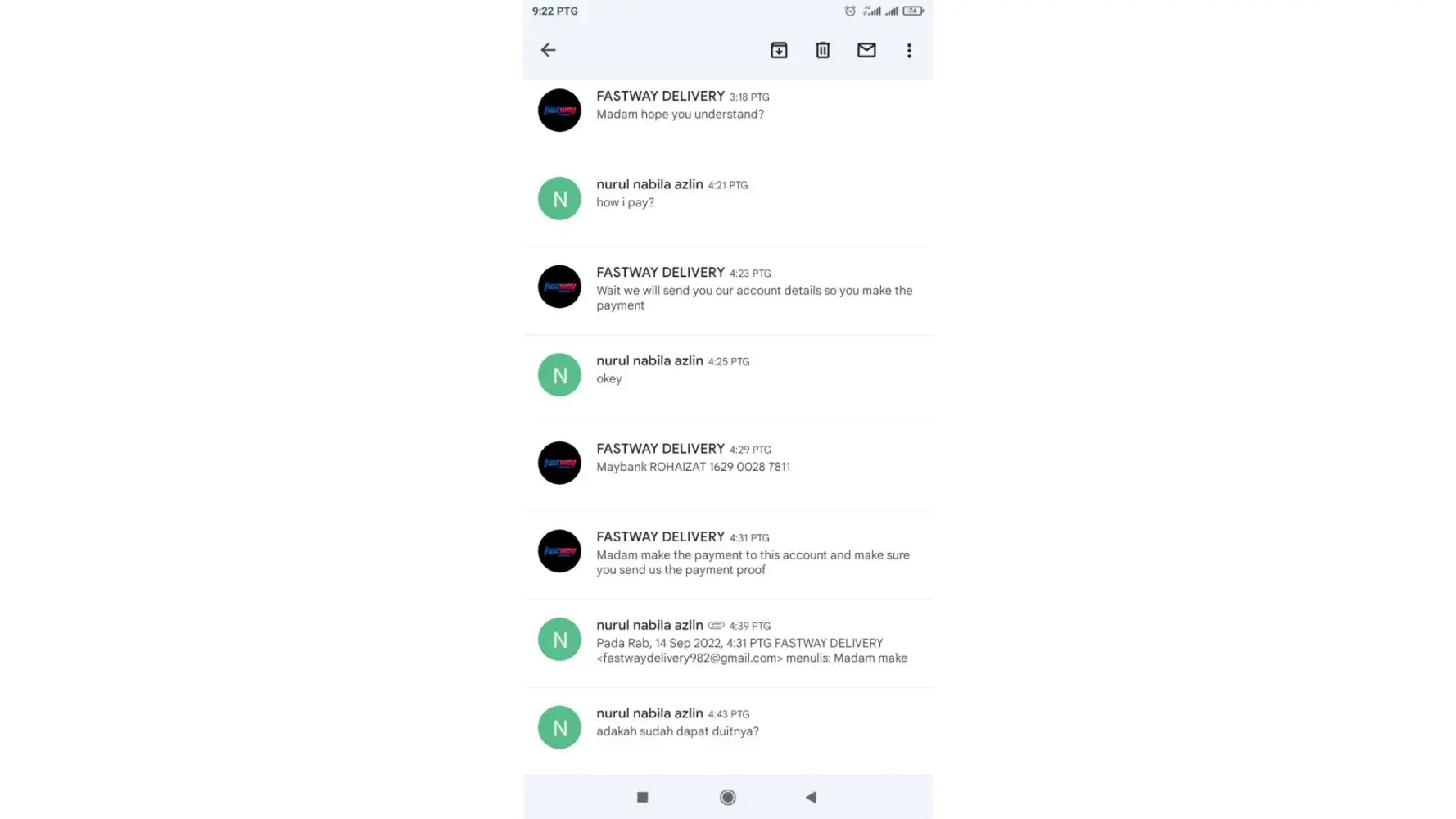 then i sent my scammer boyfriend the email asking me to pay 2, 940 ringgit in payment for them to deliver my parcel