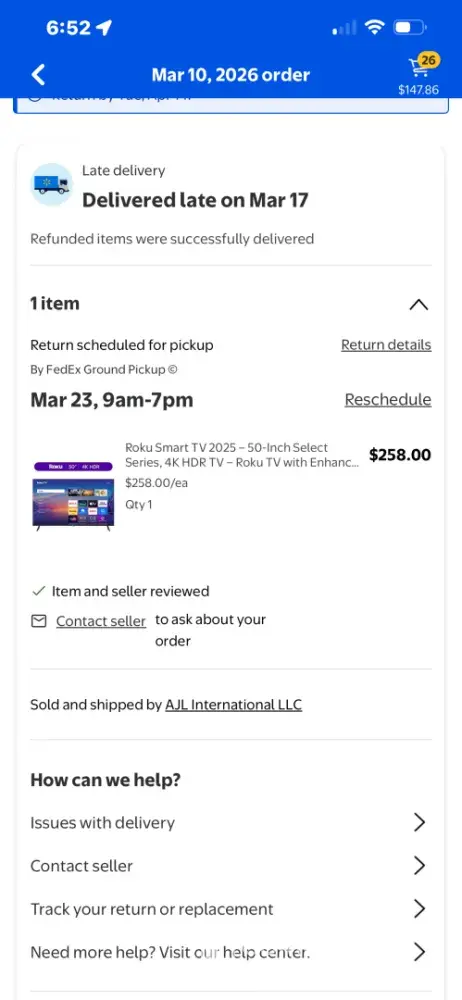 I had a package from Walmart, a Tv. It was reported missing during delivery and I received a refund. A week later it shows up. So Walmart emails me to return it or I will be charged. So I submit a return with Walmart and FedEx is scheduled to pickup the next day. The TV was there in the morning and so FedEx picked it up. Then it’s lost again.