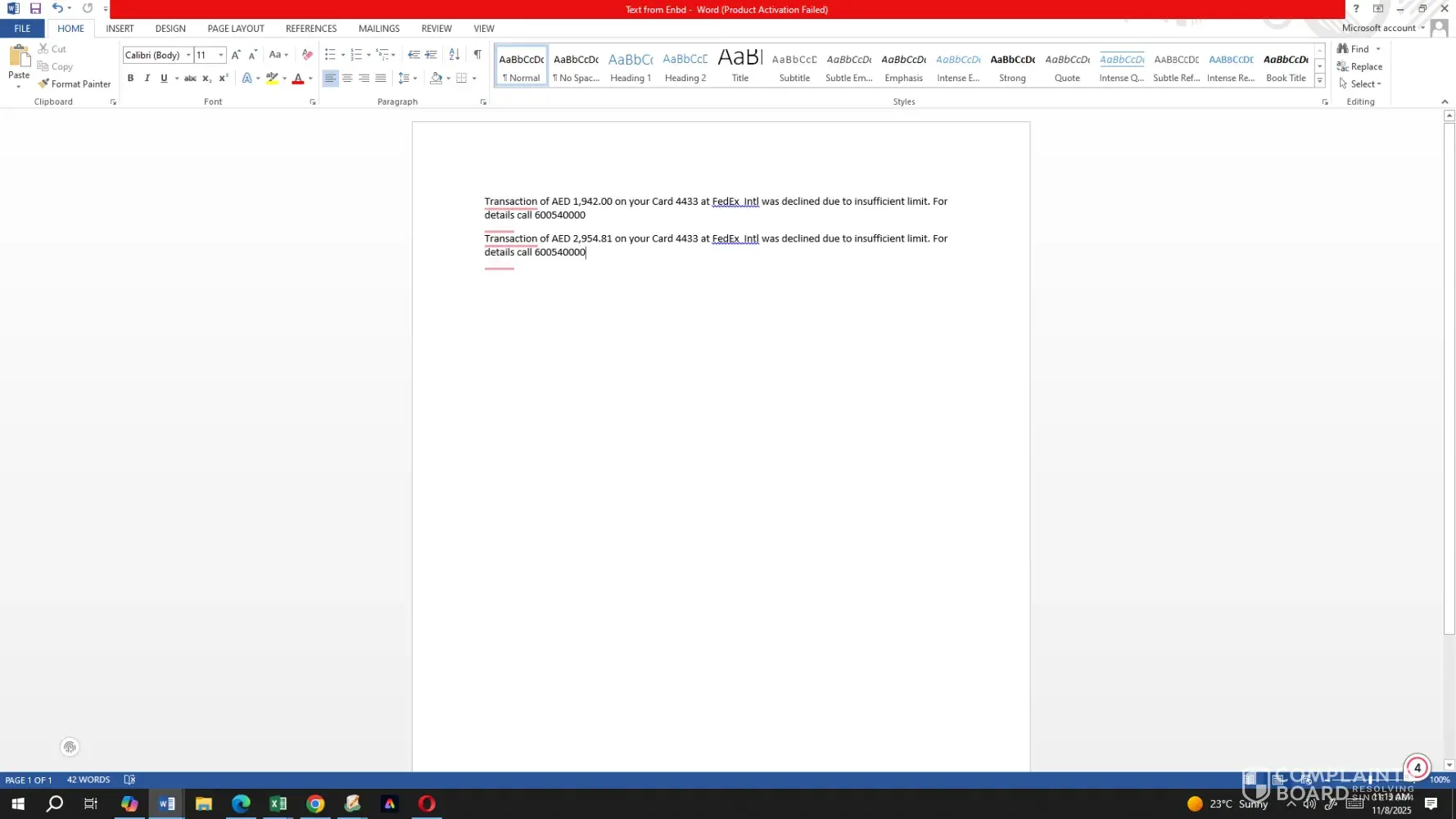 I am writing to formally inquire about two declined transactions on my card ending in 4433, attempted at FedEx Intl for the amounts of AED 1,942.00 and AED 2,954.81. Both transactions were declined due to “insufficient limit,†as per the notifications received. My concerns are as follows: • These attempts were made without any airway bill reference...