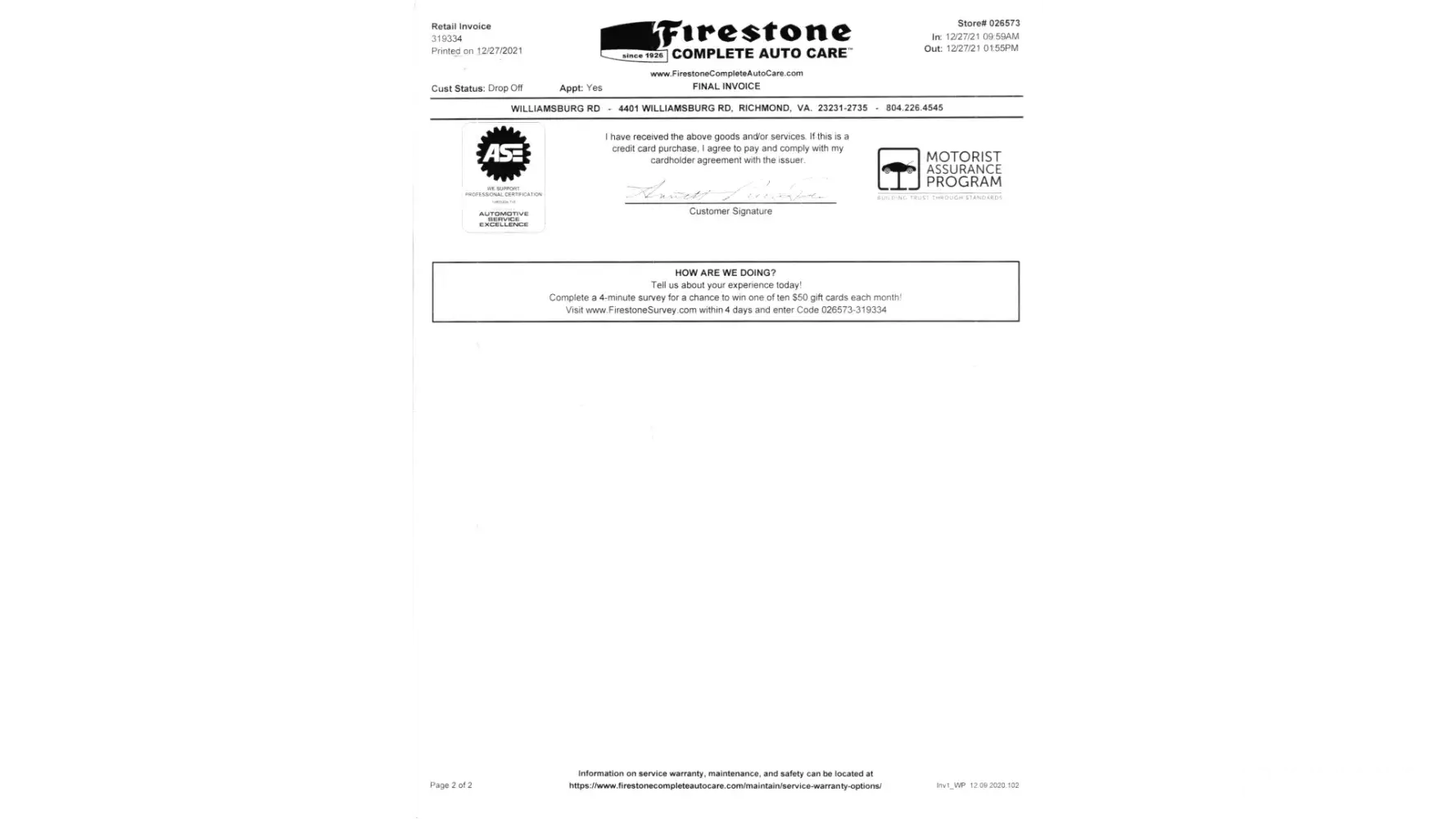 12/31/2021: came back to firestone again with the same complaint. They gave me information to file a claim.