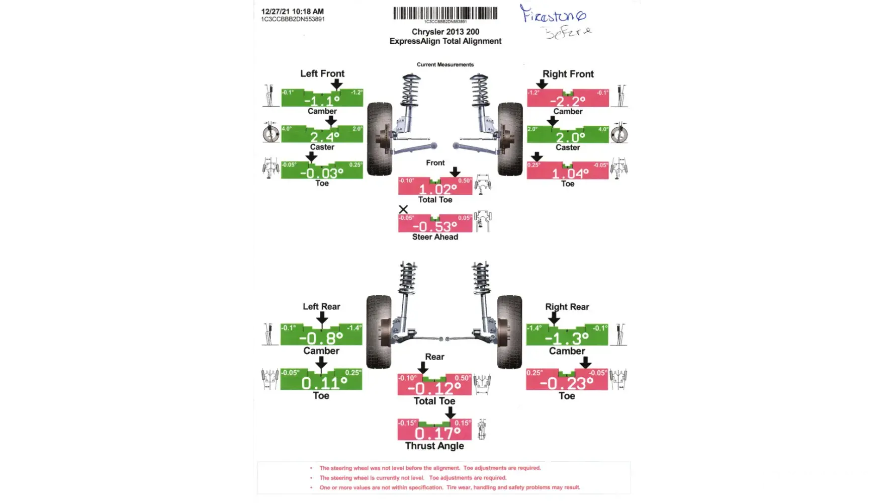 12/14/2021: I took my car to Bill Talley automotive who ran a diagnostic on the alignment done. I notice my car was pulling on one side. Found that the alignment done by firestone was off (left and right front side) and the right front strut assemble was bent. I contacted firestone immediately. They already noted I had an appt with Hayley Chrysler and Jeep. So I parked my vehicle because it was not safe to drive.