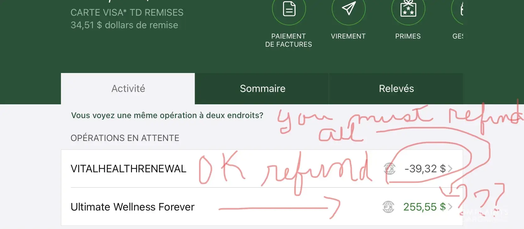 I want cancel an order and they refund only 29.95$ on the total of 255.55$. I want to cancel a purchase at ultimate wellness and I called their number [protected] no answer! I chatted at www.custommersupport.com and they don't want to cancel the entire order, they have me credited $ 29.95 while on my credit card there is $ 255.55 I want the total...