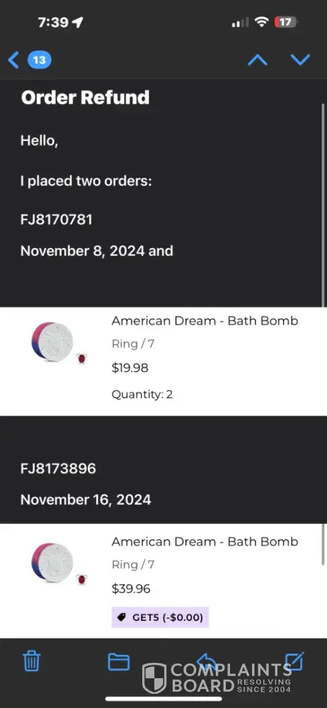 This company advertised 925 Sterling bath bomb and sent me plated rings inside of them instead. They are refusing to refund because the bombs arrived intact. Regardless of whether the rings inside were wrong. I’m looking into finding a lawyer. They’ve been paid and switching people for years and just counting on people not to complain. It’s time to complain.
