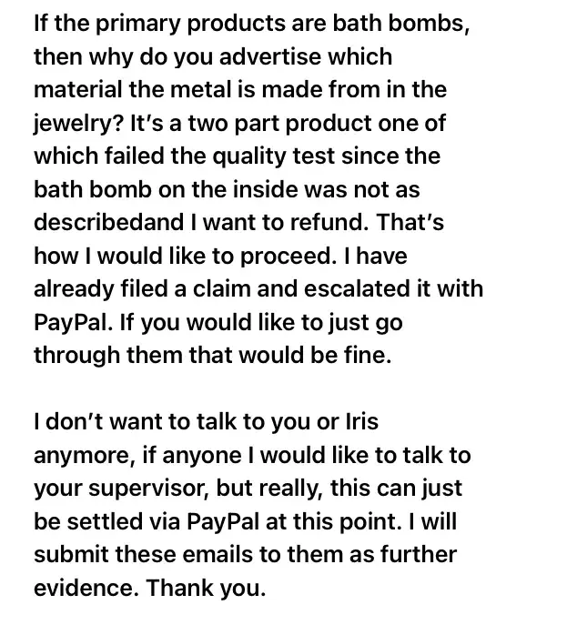 When I reached out to customer support, I was met with some of the rudest agents I have ever encountered. They made some ridiculous comments, suggesting that I should dilute the bath bomb in another tank first. I mean, seriously? That would completely defeat the purpose of using a bath bomb. When I explained that I had only touched it directly when unwrapping it, they accused me of holding onto it the whole time. It was clear that they were not interested in making things right, and they refused to follow consumer laws about defective products.