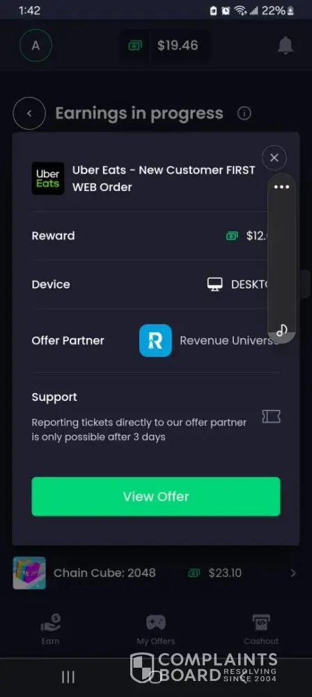 I raised a ticket and provided evidence showing the completed task. The ticket was declined with no explanation. I contacted customer services and they claimed that the Offerwall were responsible and would not provide any contact information or reason for the declining. They said that the Offerwall was not a face fronting company so I could not contact them.