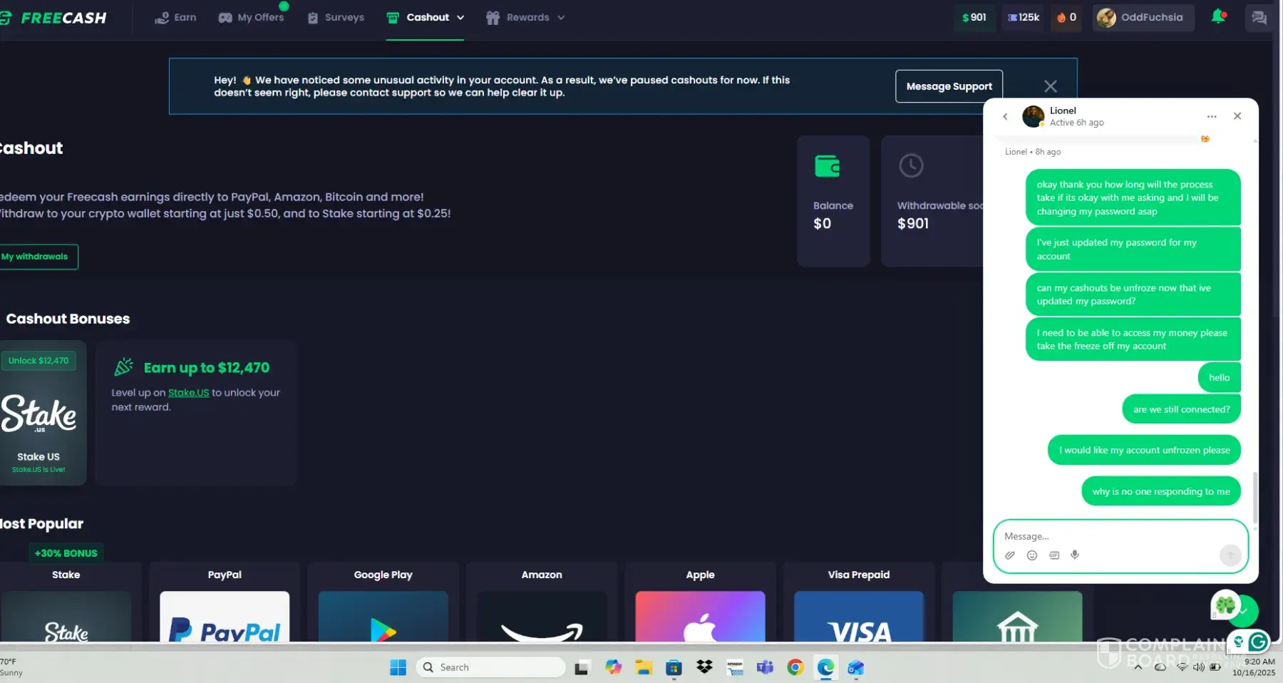 There's a message on my account that says for me to message a live agent but I have numerous times and they haven't reached back out to me I have also sent 5 emails and not one response to me yet what is going on here! I have 901.00 in my pending payout that is now "paused" I was my pending payouts restored for completeing my stake vip level offers!