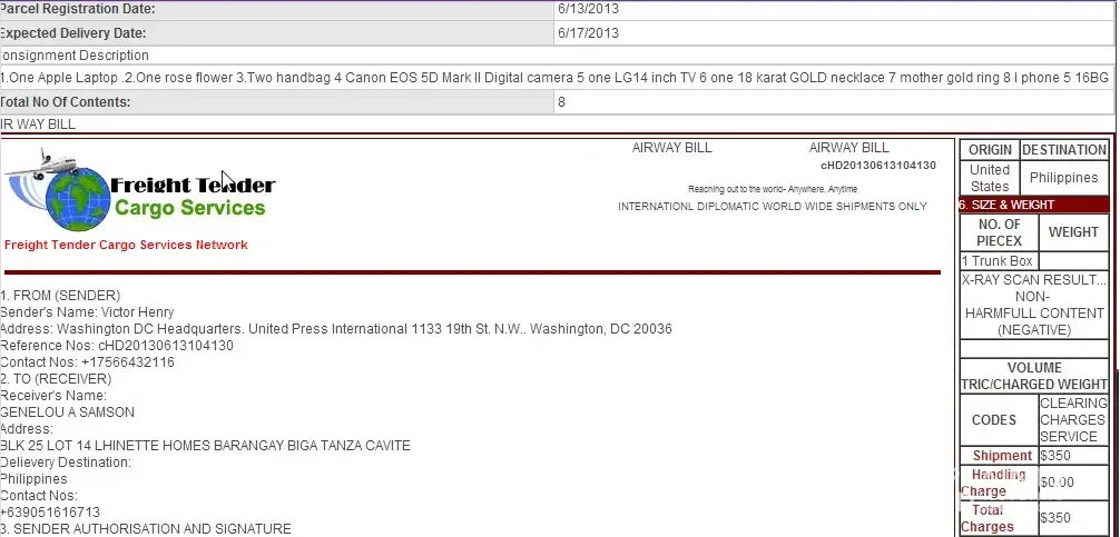 THEY USED TO HAVE A FAKE NAMES FOR EVERY VICTIMS. MORE NAMES THEY WE EXPECT AS IT WAS THEIR STRATEGY TO MADE THEIR PLAN MORE CONVENIENT. THIS TO REMIND YOU ALL THAT ON THE LIST ARE CHARLES MILLER AS A SENDER OF GIFTS AND ELENITA FERNANDO AS A OIC OF CUSTOM. THIS NAMES ARE USE THE AIR CARGO AS WELL NAMELY LOGISTIC AIR CARGO, UNDER THE NAME OF JOHN DAVID AS WELL AS THE ART OF MAKING THEIR WAY TO CONVINCE THE VICTIMS TO BELIEVE IN THEM. NOW THE CUSTOMS POLICE MANILA HUNTING THIS PEOPLE USING NAIA FOR THE SCAM. UNDER THE INVESTIGATION NBI WILL BE ON THE SIDE OF THE VICTIMS REPORT.