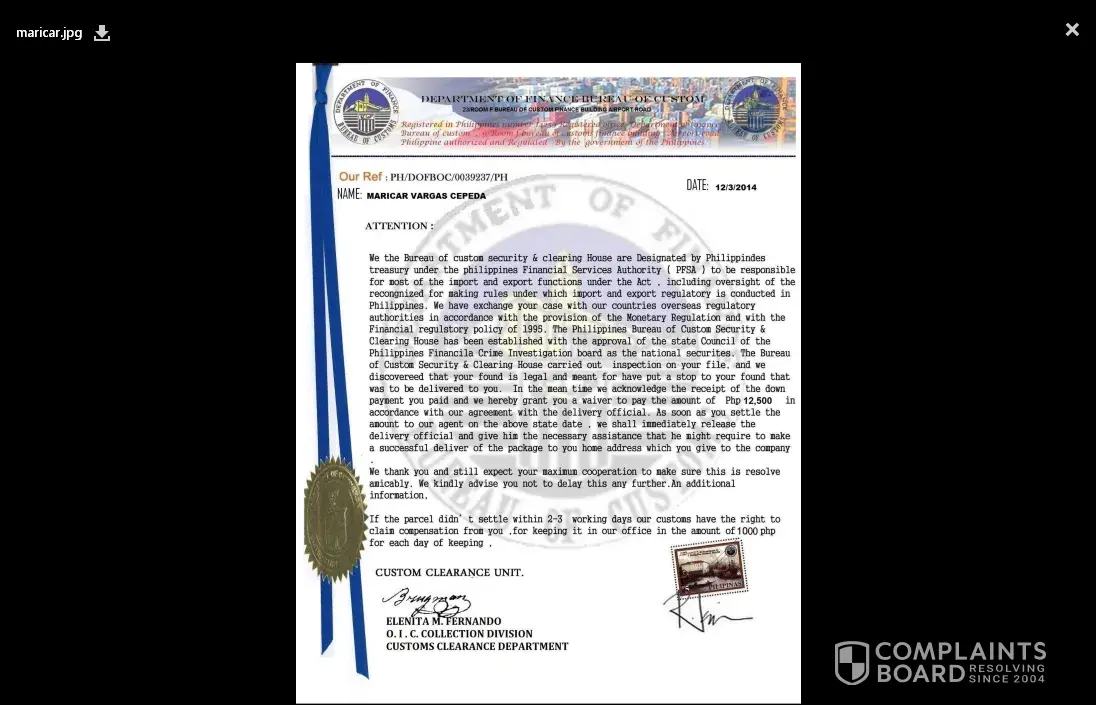 package.The requested fee is payable through western union money transfer for expediency:RECEIVER'S NAME: LIEZL D. DE JESUS.ADDRESS: # 16 DOLORES ST. FINANCE BUILDING NAIA ROAD PASAY CITY MANILA PHILIPPINESYou have 24 hours of this notice to respond to this letter or consider our disclaimer.Thank youSINCERELY YOURS, MRS. ELENITA M. FERNANDOOFFICE OF THE TERMINAL MANAGERCUSTOM CLEARANCE UNITinfo.boc-ph@qualityservice.comph-custom.qualityservice@live.com+[protected]