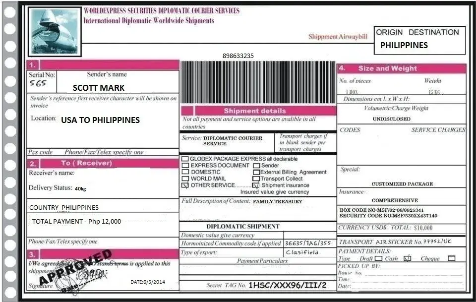 MADAM YOUR PACKAGE IS STILL HERE PENDING IN OUR CUSTODY FOR ADMINISTRATIVE AND AIRPORT CHARGES, IT WILL BE DISPATCH FOR DELIVERY TO YOUR HOME ADDRESS TODAY BY THE FORWARDER AIR CARGO AFTER YOUR PAYMENT FOR THE ADMINISTRATIVE AND AIRPORT TAXES WHICH IS 12, 500PESOS. YOU ARE ADVISE TO MAKE THE PAYMENT THROUGH WESTERN UNION FOR YOUR EASY PROCESS UNDER OUR ACCOUNTING AGENT OFFICERS NAME:LIEZL D. DE JESUS. ADDRESS: # 16 DOLORES ST. FINANCE BUILDING NAIA ROAD PASAY CITY .TEXT OR EMAIL US THE M.T.C.N@SENDER NAME AFTER YOUR PAYMENT FOR THE DELIVERY PROCESS OF YOUR PACKAGE TO YOUR HOME ADDRESS..THANKS