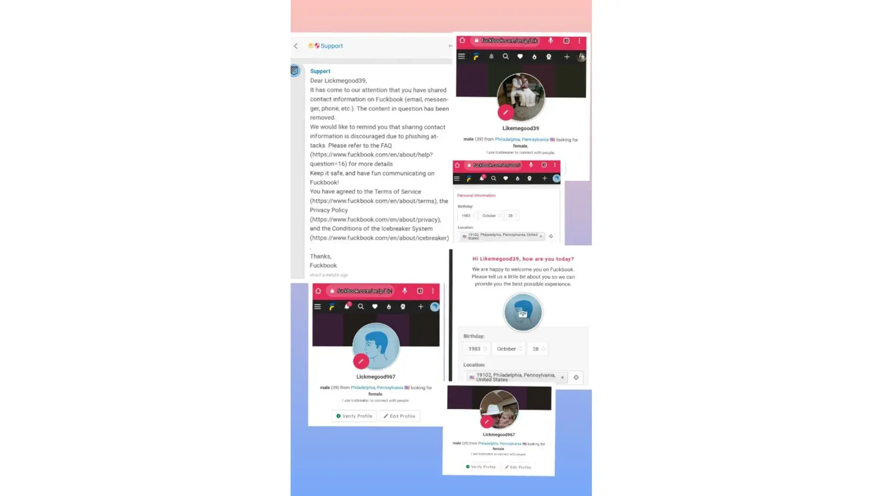 I am a married woman and my husband is on your site and I was emailing you and it came back. My husband email is [protected]@gmail.com and his user name on this site is called lickmegood39 and you need to remove him and he doesn't live in philadelphia pennsylvania and he lives with me his wife and we live in ct and his dob is not october 28, 1983 his real dob is [protected] and your support messaged him stating he was in violation of your terms and I have all the information you need.