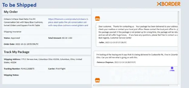 Greetings, I have ordered porch furniture from this company on October 24, 2022. I have reached out to the company numerous times for status updates, and they keep informing me that it has been delivered to my post office. There is no package left at the post officer (five-piece porch furniture). I asked them to reimburse me and they keep telling me to check with the post office. [protected]@noreply.xborderecommerce.com