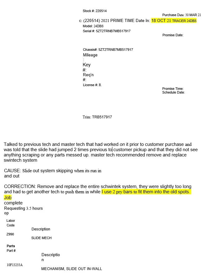Desired outcome: Repair the new camper we purchased. return calls and emails.