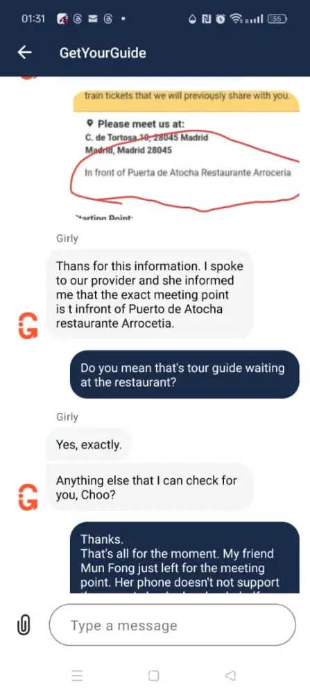 After several telephone conversations and once the facts were exposed to the person who attended me one of the workers tells me"there is a translation mistake of the website (from GET YOUR GUIDE) from English and that it is not a physical guide, but a paper guide", which, at first, seemed ridiculous to me and that there must have been a person waiting for us at the station with the guides and tickets, which, of course, was not true since we were at the station half an hour in advance and also, we were the only Spaniards on the bus, so if we had not been located, it would have been easy for our factions, or else, to contact us through the telephone number provided in the reservation.