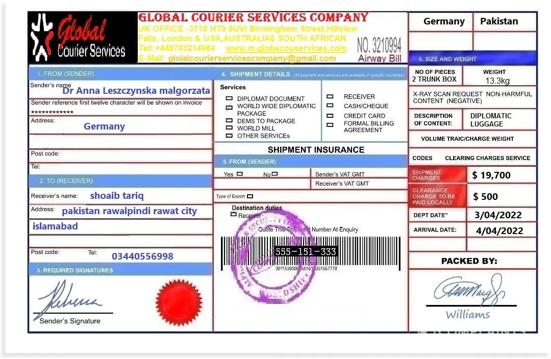 Do contact the GLOBAL COURIER DELIVERY SERVICES company with the contact information below for further instructions on how to send the consignment to your location and the amount to be charged for the delivery.