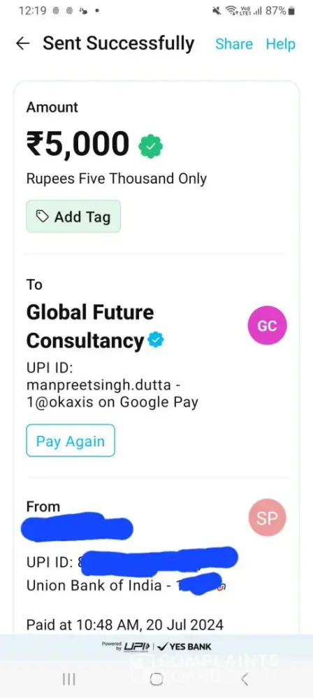 Hi All for my safety I am not posting my complete name because these Scammers can cause me harm as such i am justing putting my initials of first name, Please take time to know how i got scammed by Gurmeet from Global future consultancy. I'm here to request you all not to fall into this Global Future Consultancy trap located S.C.O 139 – 140, 2nd Cabin No. 207, 9-D, Chandigarh, 160009. Since 1 month a person named Gurmeet went on calling me convincing all possible ways and told me if I pay only 10000 Rs that's enough remaining consultancy fees which is 3.60 lacs will be deducted from my salary in installments after getting job in Canada or Newzealand. I have her call record which so clearly she said Mam you have to pay only 10 thousand nothing more than that. After you pay 10 thousand we will send you agreement form and offer letter just sign it. She convinced me to an extent saying Mam do you believe in Karma please trust me Mam if I cheat you Karma will not leave me, what will I gain in your 10 thousand blah blah blah all honesty talks she spoke. When I believed and made 10 thousand payment she sent my agreement which is now asking me to pay another 50K. I was so shocked reading the agreement. When I called her and said this is not right she never told me anything about 50 thousand she told only 10 thousand was the amount I had to pay and believing her I paid . I told her if she would have told me about that 50 thousand rupees I would have never sent her that 10 thousand. But now she is talking rudely and so dishonesty behaviour that she is denying the truth. She is saying she never gave false promises. I have full call record proof in which she said nothing to be paid more than 10 thousand rupees. I felt do disheartened that how can people cheat so easily. What kind of dirty parents dirty upbringing is that?. How are this Manpreet singhs and Gurmeet parents and family eating food earned by their daughters cheating with public money. Will such people's family live a healthy life cheating publics money? And now she says her Madam her boss Manpreet Singh is responsible for all this. Says that Manpreet is busy. I sent that Manpreet Singh 10 thousand on 18th July 5000Rs and 20th July 5000Rs please check the screen shots attached of payments made. It's so painful to lose your hard earned money to such scammers. I hope really police take action on this Gurmeet who along with her boss Manpreet Singh cheated me. I really Karma punishes both these people severly. I really ask God to return 10 fold pain loss to this Manpreet Singh and Gurmeet parents, children and family only then they will understand how it feels to get cheated and live on others hard earned money.