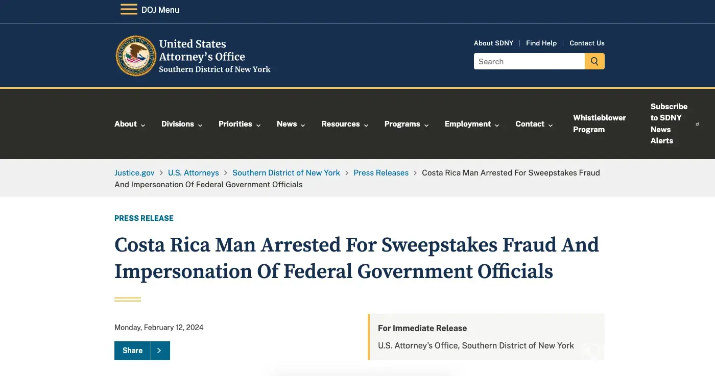 https://www.justice.gov/usao-sdny/pr/costa-rica-man-arrested-sweepstakes-fraud-and-impersonation-federal-government