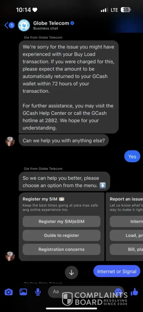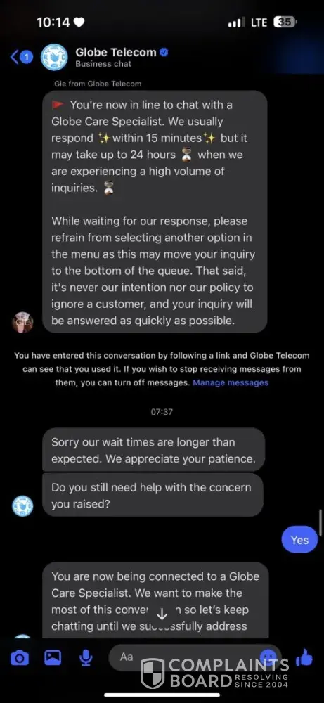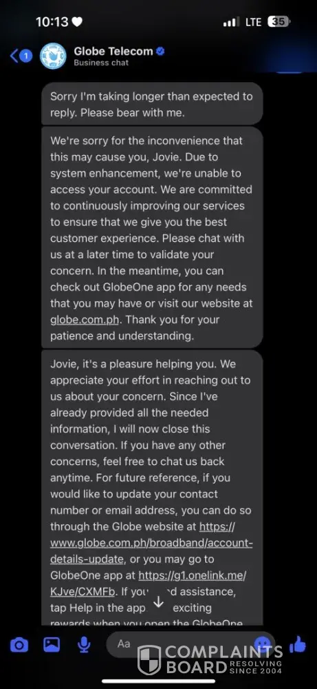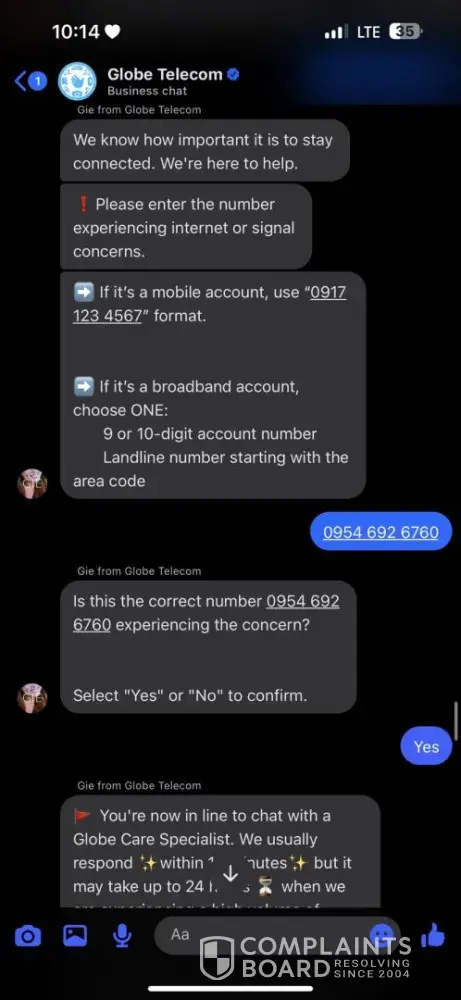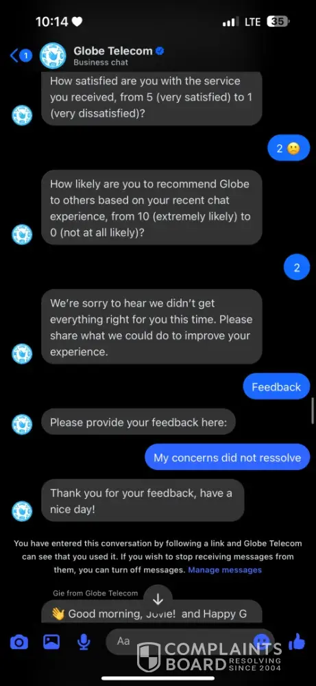 - While Globe Telecom has a high level of trust, our investigation has revealed that the company's complaint resolution process is inadequate and ineffective. As a result, only 5% of 641 complaints are resolved. The support team may have poor customer service skills, lack of training, or not be well-equipped to handle customer complaints.