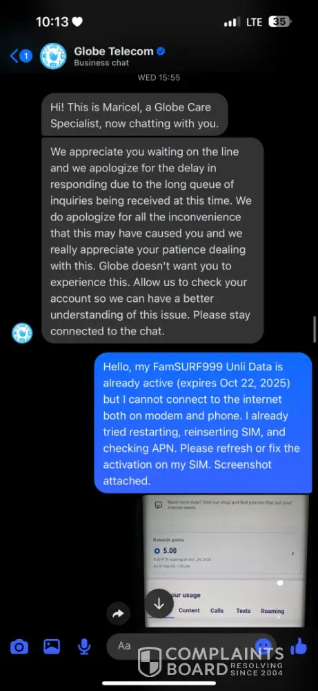 Good day, I would like to file a formal complaint against Globe Telecom regarding their FamSURF999 promo. On September 22, 2025, I registered for FamSURF999 using the number [protected], amounting to ₱999. The promo should provide unlimited data for 30 days, but until now, the unlimited data has not been working despite being successfully charged. I...