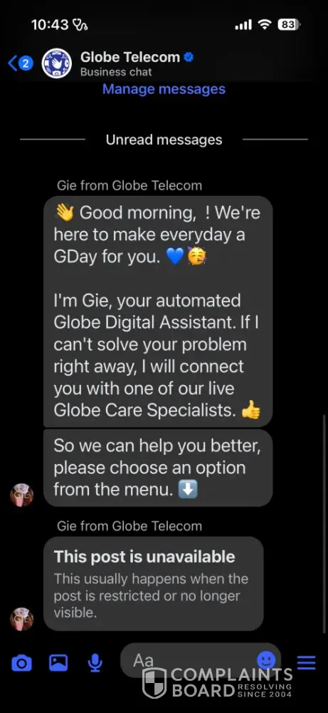 Ako po ay nais magreklamo kaugnay sa aking Globe internet service. Nagsimula ang problema noong September 26, 2025 (panahon ng bagyong Opong), at mula noon ay nawalan na ako ng maayos na internet connection. Nag-request ako ng technician visit, at ang unang schedule ay October 1, 2025, pero nakatanggap ako ng text mula sa Globe na kinansela ito at...