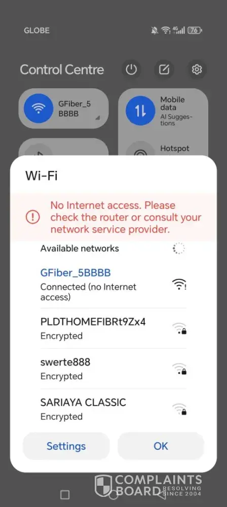 March 25,2026 around 12am-2am Since my internet connection indicates no internet access but the modem are all green and blinking, then March 27,2026 I tried to report it via Globe One app but the app keep on redirecting me thru messenger which the next day I did and I hot a message that a technician will come on march 31 8:00am-12:00pm to check it but when...