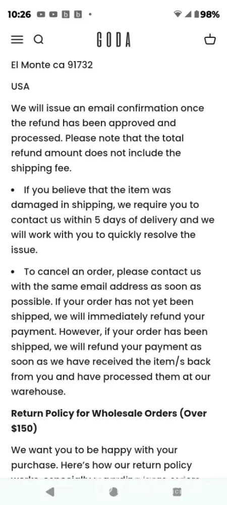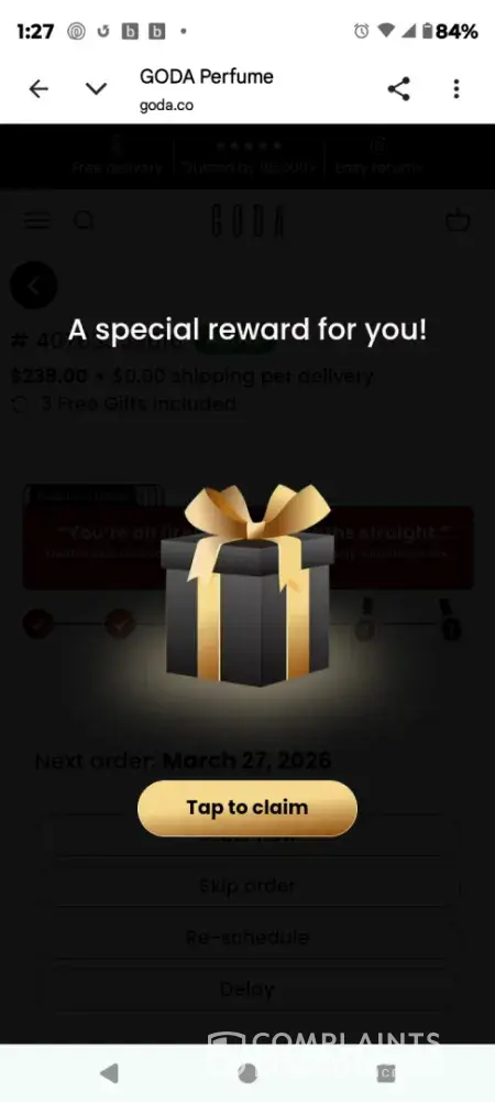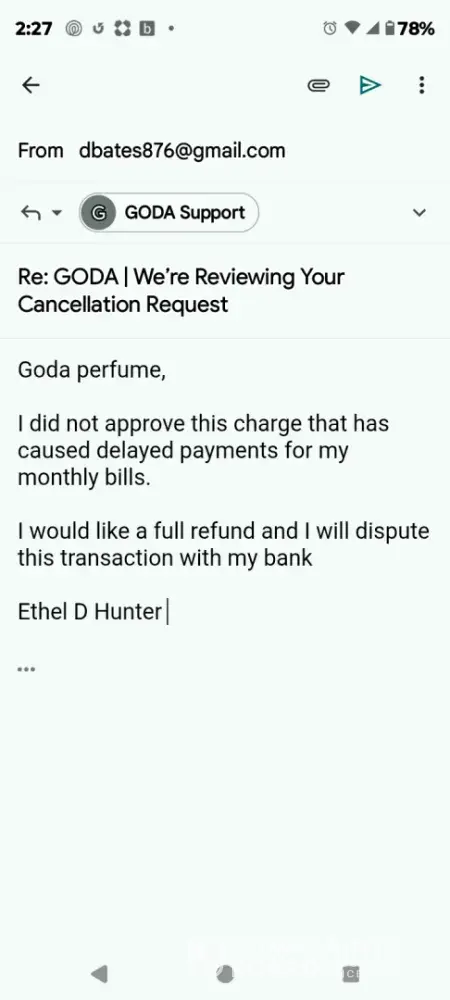 GODA Perfume has caused a delay in paying my monthly bills! My bank sent me an email notification showing a transaction for $238.00 from Goda perfume, this transaction was not approved by me. I contacted Goda via email at 9:30am on Friday February 27, 2026 to cancel the order before it is shipped because the policy states to email if need to cancel...