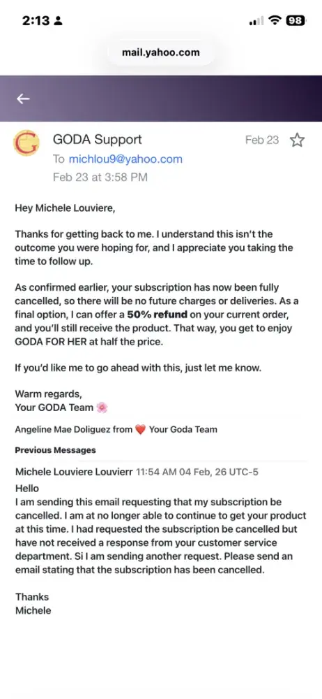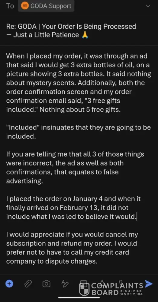 I placed my initial order on 09/17/2025 (order #GP666380) paid for and received the perfume. Since the initial order I have received two more bottles and was charged $34.00 each time. I figured I must have been tricked into inadvertently signing up for a subscription. I have emailed support@godaperfum.com at least 3 times, today being the third time asking...