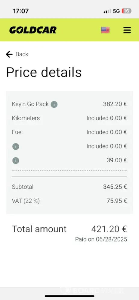 On the 5th of June (when I picked up my car) with my card I had to pay 374.65.