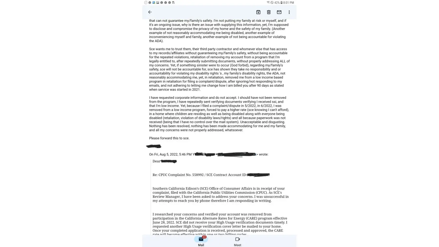 Filed a complaint against SCE last year, instead of referring me to a disability advocate (as advertised via email/website), cpuc decides to violate my disability rights, along with sce, failing to properly investigate, and simply took forever to respond, while referring me back to SCE, despite all of my personal/family information being sent to them...
