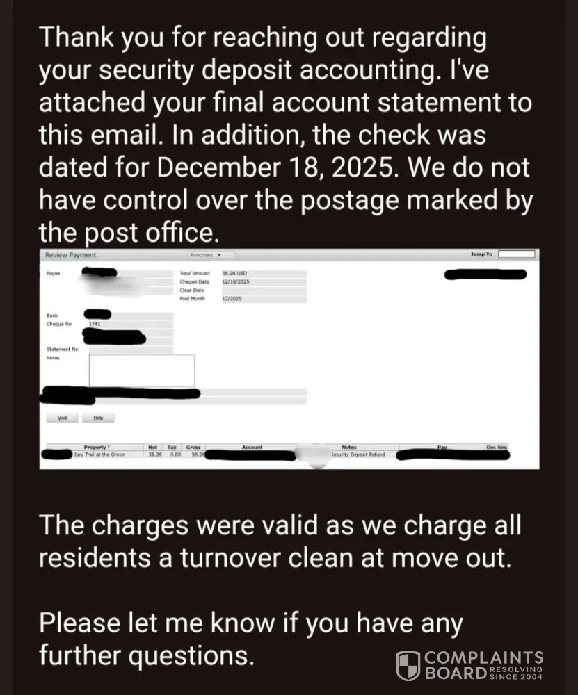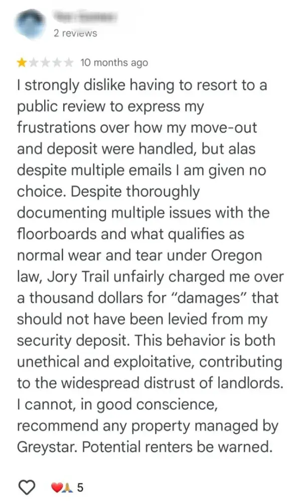 After moving from Jory Trails in OR in Nov 2025, I received a security deposit refund check of $38.26 (out of $500 with $161.74 going to my final utilities) with no explanation of the deductions. Upon reaching out, they explained that they charge every tenant for cleaning after vacating, regardless if the unit has sustained heavy damage, normal...