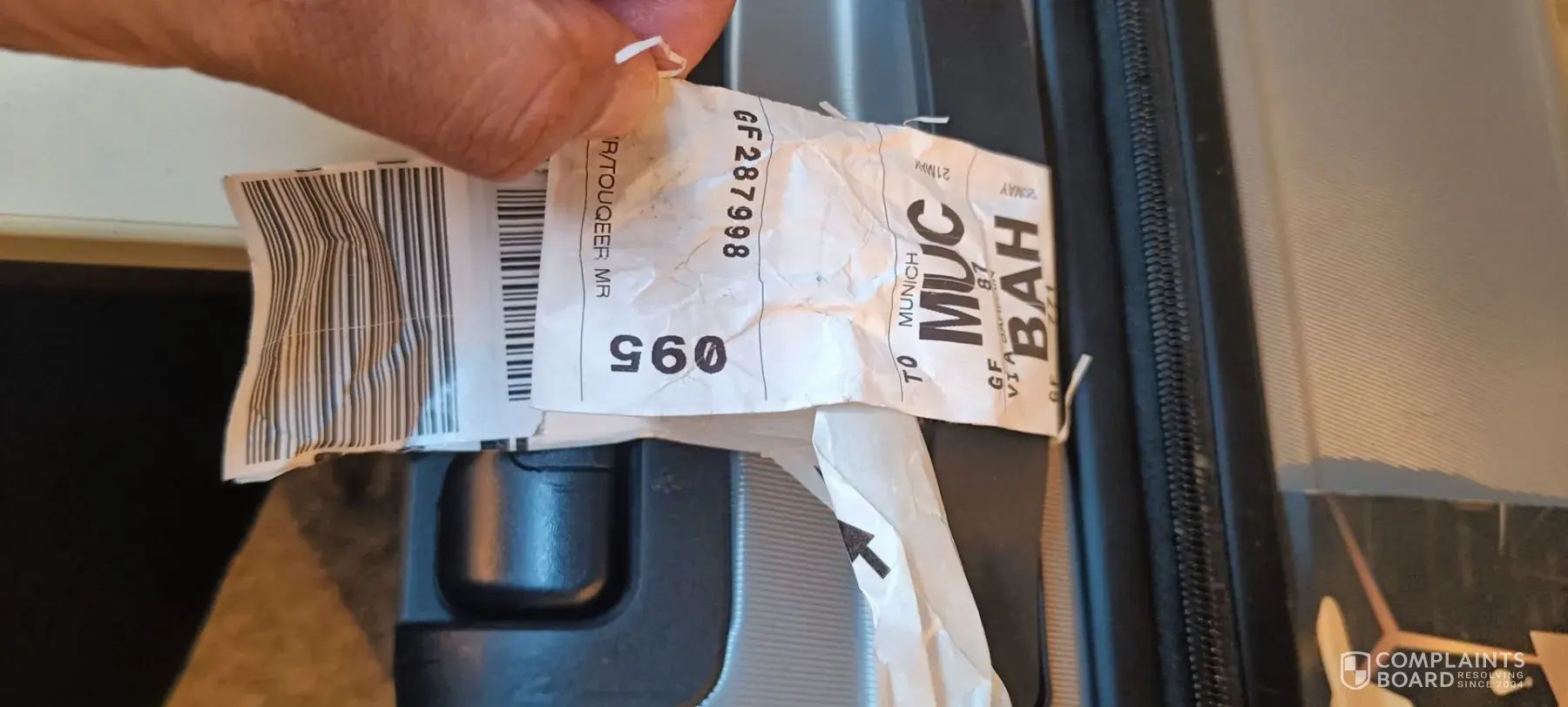 I was travelling to Germany from India on 27th April along with my parents from Mumbai to Frankfrut via Bahrain. We checked in 6 no of baggage's but on 28th April morning at frankfrut we received only 5 no of baggage's. When we checked with airport baggage claim department it was found that only 5 stickers were attached to the boarding pass so final received was only 5 nos. It is fault of the staff that they missed out to attach 1 baggage.