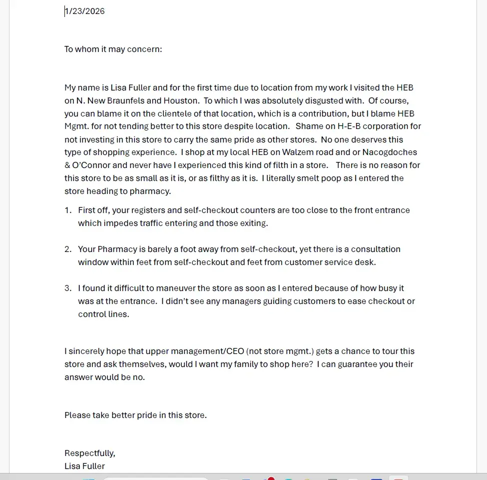 1/23/2026 To whom it may concern: My name is Lisa Fuller and for the first time due to location from my work I visited the HEB on N. New Braunfels and Houston. To which I was absolutely disgusted with. Of course, you can blame it on the clientele of that location, which is a contribution, but I blame HEB Mgmt. for not tending better to this store despite...