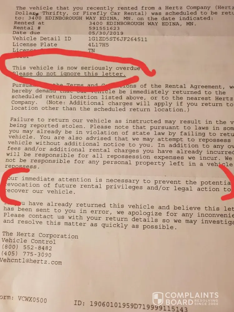 Got a letter yesterday from hertz stating, I needed to contact them immediately or they were going to report the car stolen. Called them immediately, was on the phone 30 minutes. Agent told me I had not returned the car. Told him that was not correct...:) and told him what happened. He said "ok, we'll check into it and if we can find out what happened, we'll correct it in the system."