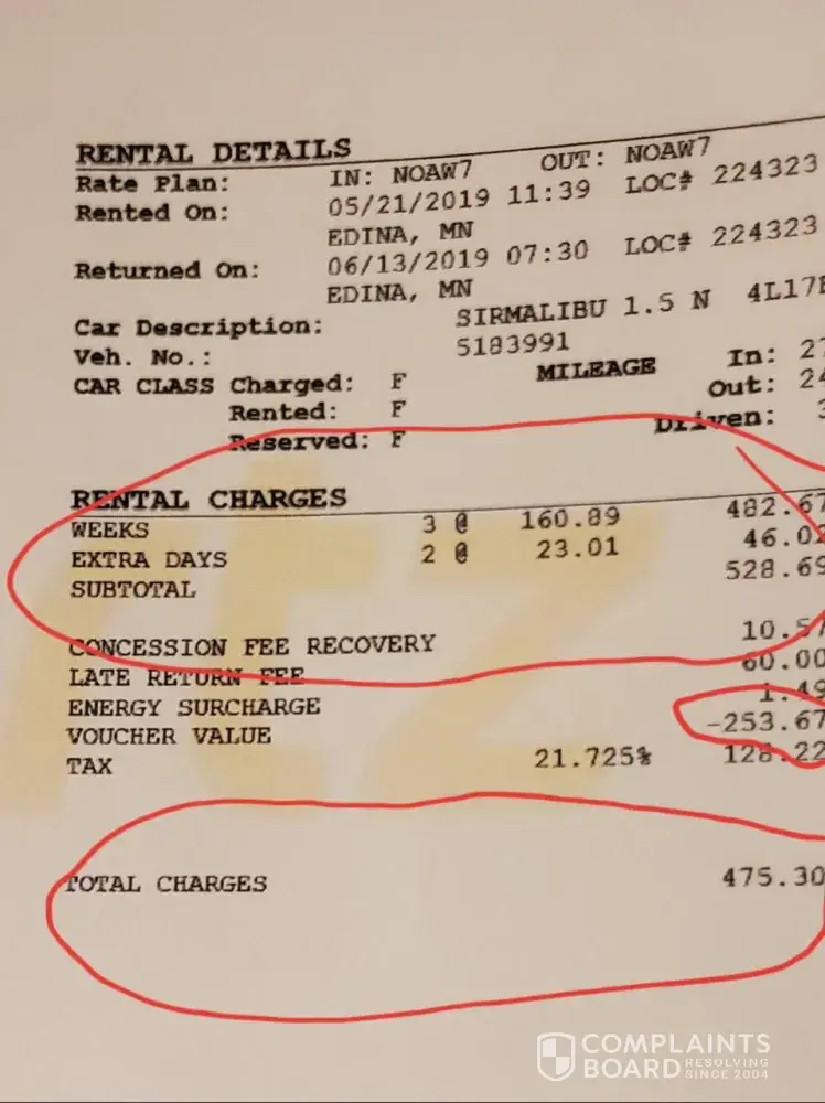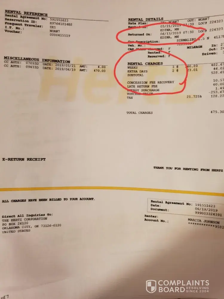 I received an email today with an additional charge on my credit card of $475.30. Called hertz again. Got a female agent this time. Asked her if there were notes on my account so that I wouldn't have to repeat the whole situation again. She said, no, so I went thru the whole story again. She cut me off and said "you left the car keys with a guy in the hotel?!" I corrected her what was seemingly trying to set me up accusation. Keep in mind, I received the letter yesterday, on the 17th, I called the first time on the 17th. As of yesterday, I was told the car still had not been returned. The email I received today said the rental was from may 21st to june 13th, 3 weeks and 2 extra days.in addition, the statement said I had driven the car 3, 080 miles (in 9 days) the only distance that I drove was from edina, mn to west des moines, ia. Which is approximately 500 miles, roundtrip. Sooooooo... Forget the fact that I would have to have been one driving fool, literally could have gone from the east to coast to west coast with that amount of miles but where did they come up with the date of return on june 13th?