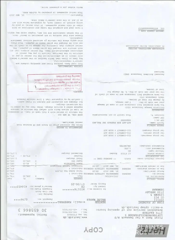 Attached, I have outlined the issue I had when I rented a car in Copenhagen, Denmark where I was on holiday with my family. We were visiting from Canada. I have also attached a copy of the Rental Agreement #30 655866 3 which is in my daughters name, Karen Halse.