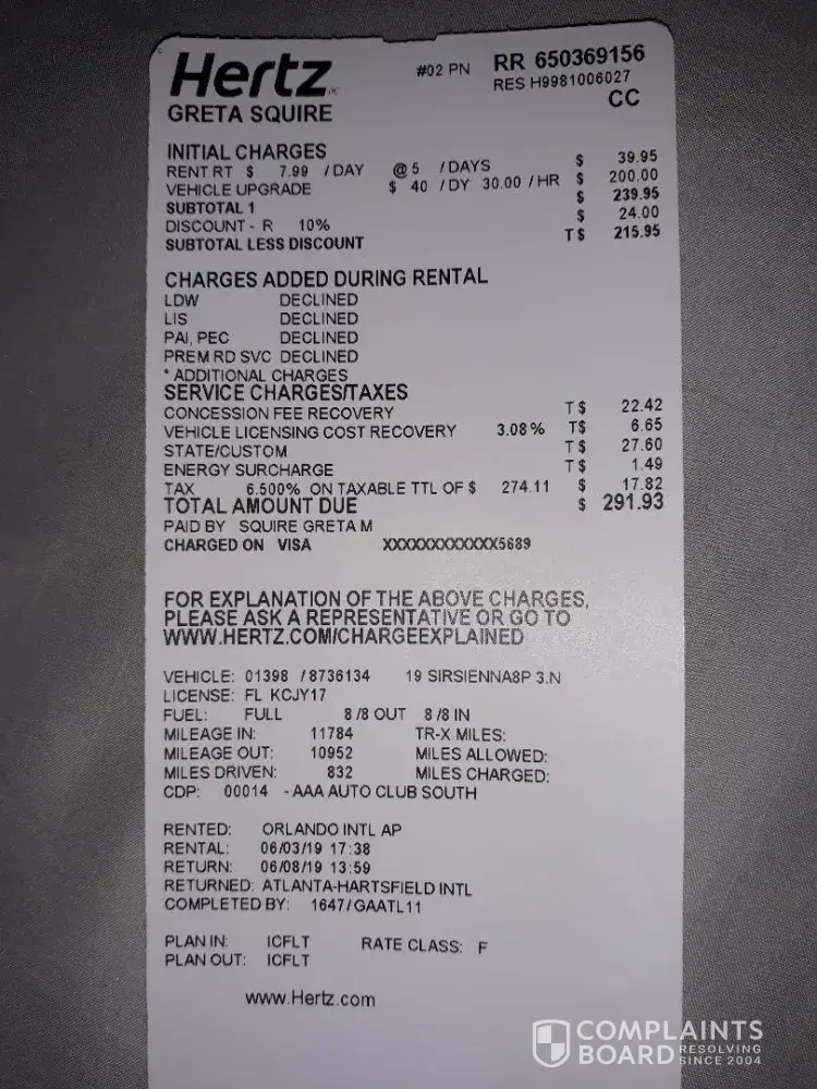 I rented a vechical from Hertz on June 3 2019 with 8/8 tank of gas in it and returned it on June 8 2019 with 8/8 tank of gas. But they charged me $49.00 for gas, which is incorrect, because i returned it with the same amout of that wsin it when i rented it. My RR # is [protected]. I have enclosed a copy of my receipt as well. My name is Greta Squire and my # is [protected] is there is need to contact me.