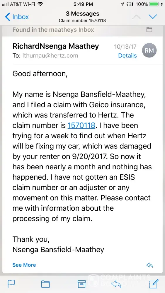I was rear-ended by a driver who was driving a Hertz rental vehicle on September 20, 2017, on the Bronx River Parkway in New York. The renter had collision insurance with Hertz. I originally filed a claim with Geico, which transferred the claim Hertz. Hertz, after some time, transferred the claim to yet a third party, and provided me with claim number, but they have yet to fix my car. A full month has passed, and I am getting the run-around. Hertz gave me a telephone number that nobody answers. The claim number is 8B564955966587. I need assistance with this. I just want to get my car fixed.