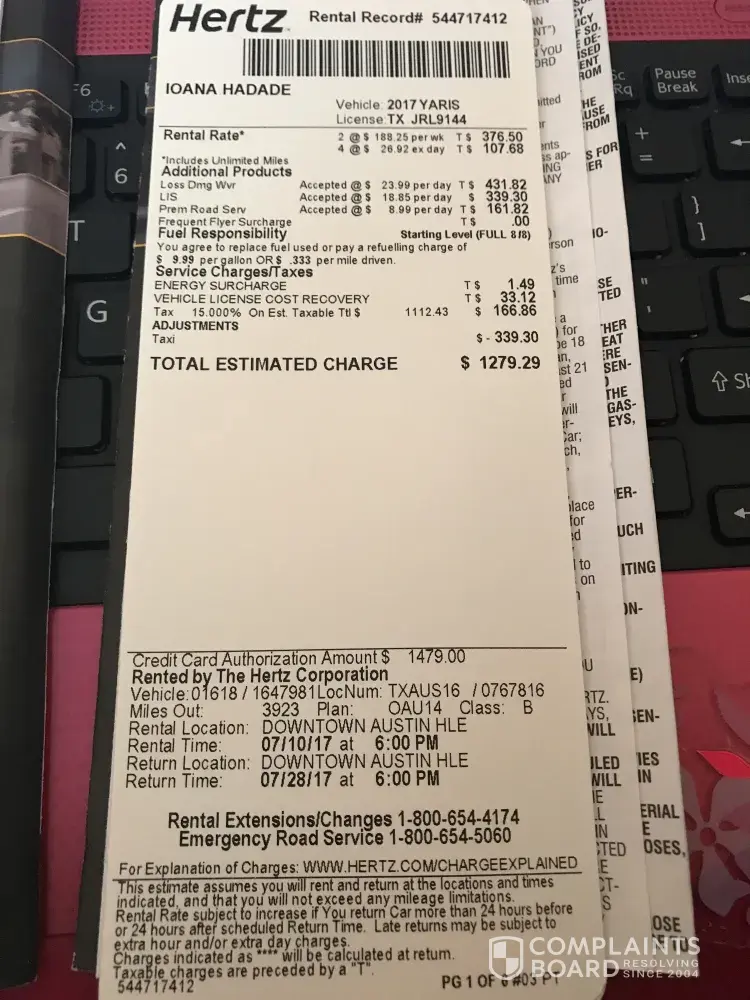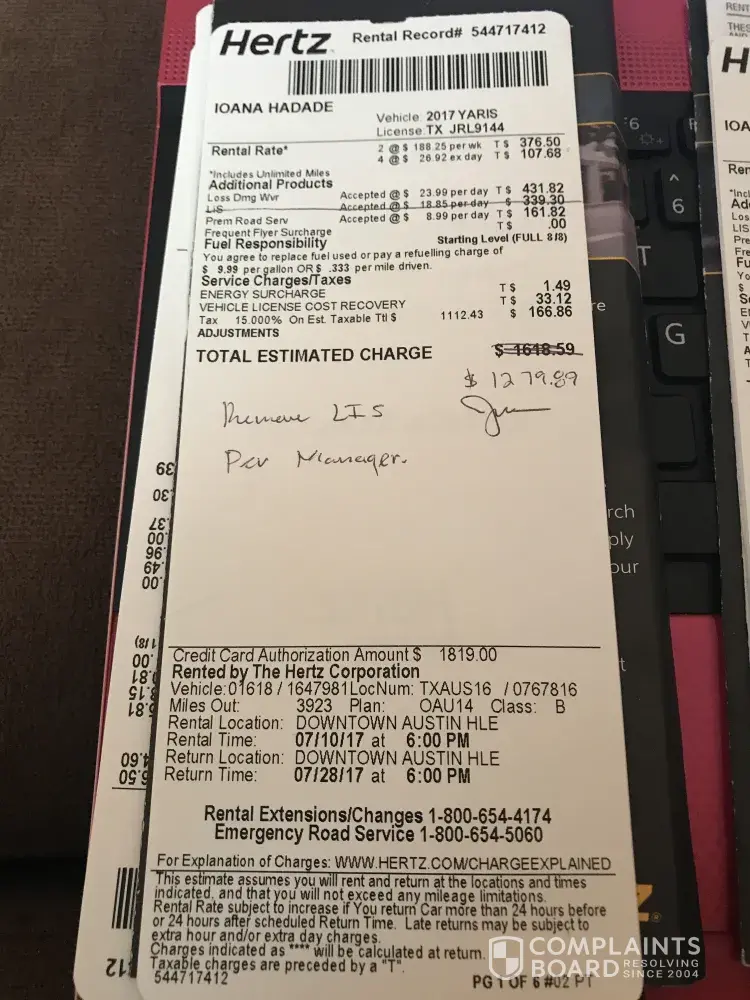 Me and my sister rented a car from the Hertz company on 709 E 10th Street in Austin. As you can see attached we were quoted a price of $1279.29. We get home and check our bank account to notice that the card was authorized for $1819 so I called the office but they told me they don't know what happened and they can't fix it over the phone so we had to drive to the office and see what happened. When we got there, Joseph, the MANAGER from who we rented the car was there so we asked him what happened and he realized he accidentally chose the standard insurance package instead of the basic one that we chose. He did not even apologize, just said 'Oh I see what I did, I chose the wrong option', and as you can see in the attached picture he did not even bother to print us a new receipt but scratched on the old one and wrote in pen the right amount saying that we should see the difference back into our bank account within the next 48 hours, not to mention he did not even bother to tell us that he is going to hold $200 for a security deposit as well. All good, we went on vacation for a week and kept checking out bank account but the difference never dropped off from our bank account so on our way back home we of course had to stop by the office because nothing can be solved through the phone with them. Fortunately, when we got there, there was another employee, I did not get his name but he was super nice and helpful so we explained to him what happened and told him we were told the money would drop back into our account after 48 hours but they haven't. He was surprised we were told that because he said the money won't drop back until we drop off the car and they release the entire authorization and then it could take up to 7 business days to get the money back. Of course the entire situation was really frustrating because they were holding our money for a stupid thing they did and were unable to fix it. However, I asked the guy to please check in the system and make sure that at least the manager had changed our package so we won't get charged more than we were supposed to because it looked like the manager had no idea what he was doing at this point. He checks the system and looked very surprised so I asked him 'he did not change it, did he?' and he admitted that his manager did NOT even change it into the system, so he changed it for us and printed a valid receipt for us. I work in customer service and this has been by far the WORST experience ever, especially considering how big of a company Hertz is. I would honestly not recommend Hertz to anyone every!