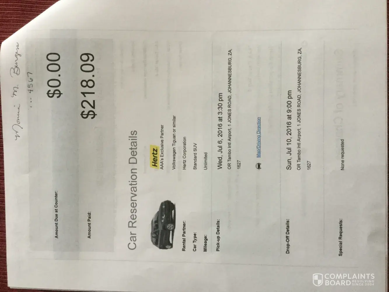 We were told that since the reservation and confirmation were made without our credit card number, Hertz was not guaranteeing anything.