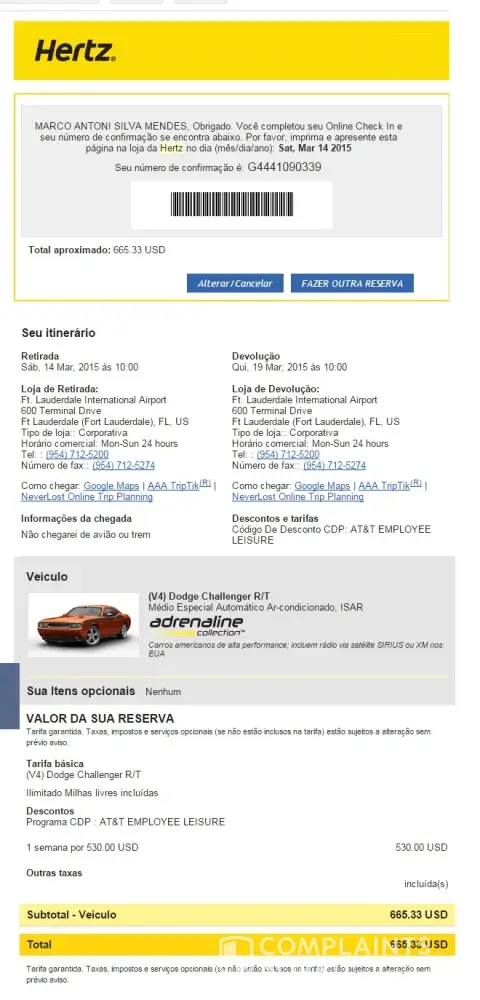 On January 2015 I've place a Adrenaline Car collection reservation for a Dodge Challenger R/T, for a rental scheduled to March 14th. On March 5th, I've made the check-in as asked by Hertz, online, stating that I would honor my rental. A couple of days before my rental date, I got an email from Hertz informing some details about my rental reservations and it was all ok.
