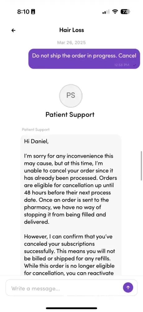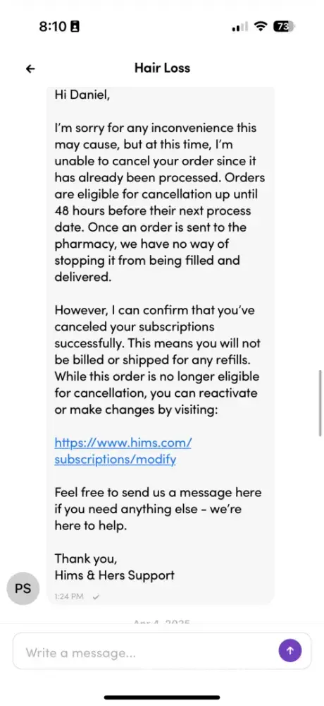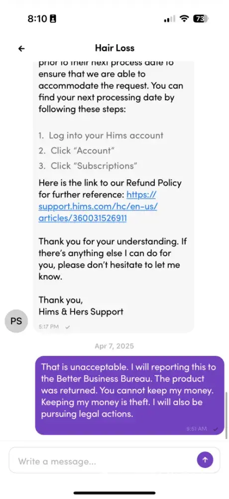 Here is a formal complaint tailored for submission to www.complaintsboard.com: ⸻ Title: Hims & Hers Refuses Refund for Returned Product Despite Cancellation Request Complaint: On March 26, 2025, I contacted Hims & Hers via their in-app messaging system to cancel a hair loss product order that was in progress. I clearly stated: “Do not ship the order...