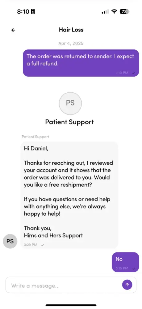 I ordered one of hims's prescription hair loss treatments. The first package arrived and the bottles of medication had leaked all over inside. The company refunded part of the order and shipped a new one. Same thing, leaky bottles. I waited t0o long to reach out so they said they couldn't do anything to resolve it except offer a discount on a reshipment. So I paid them an additional $100+ to get a third shipment. This one was the worst; the bottles had leaked all over and were wet inside the package when it arrived. The company refuses to do anything other than a partial refund and refuses returns. Unacceptable and possibly illegal for prescription medication. AVOID THIS BUSINESS.
